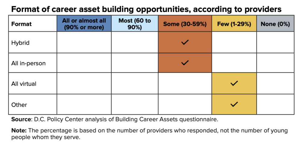 Most career asset building opportunities are either hybrid or entirely in-person. A few are completely virtual. Travel to a third location during the school day could be a hindrance for some students: The average high school student traveled 3.2 miles to school in school year 2023-24, and students in Wards 7 and 8 traveled farther, at 3.9 miles and 4.4 miles, respectively.22 Providers mentioned in interviews that barriers such as location and generational poverty have proven tough to overcome—this limits participation of additional students and makes it harder for current students to thrive. Responses in the questionnaire to location by ward were not specific enough to adjust for the size of programs. Although providers reported that career asset building opportunities are available throughout the city, further research is necessary to determine where young people are accessing them.