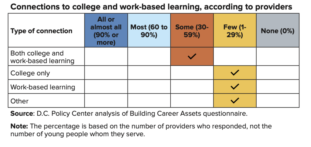 - In addition to the framework of work-based learning (see Appendix D) developed by CityWorks DC and strategic partners, it would be beneficial to map available postsecondary degree opportunities to a continuum of activities and identify gaps in how providers connect young people to college.