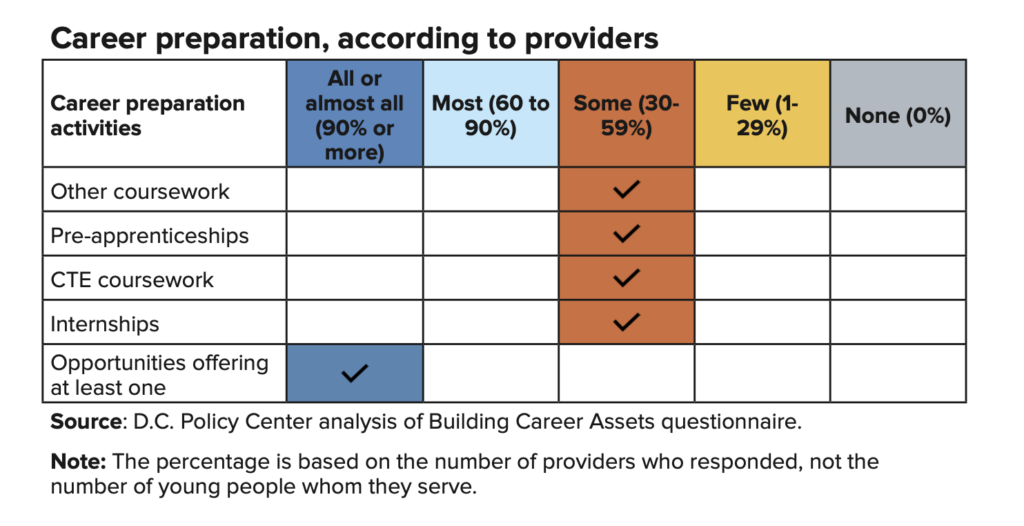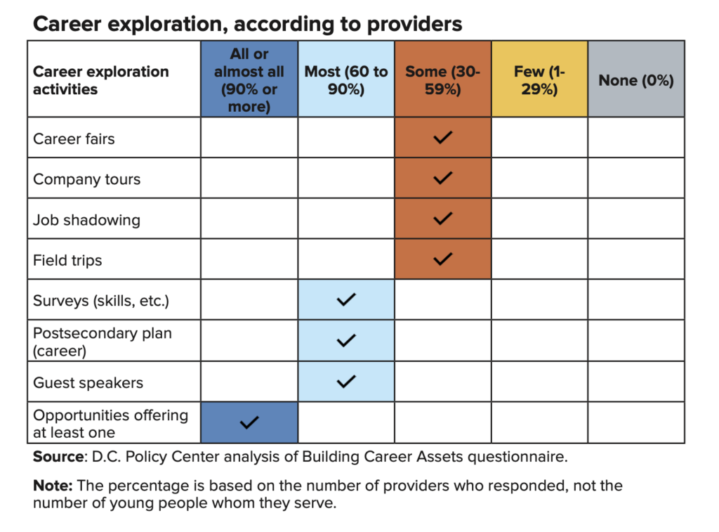 - Out of the 35 opportunities that include work-based learning, activities during these opportunities are more likely to allow young people to explore careers or prepare for careers instead of to launch them.