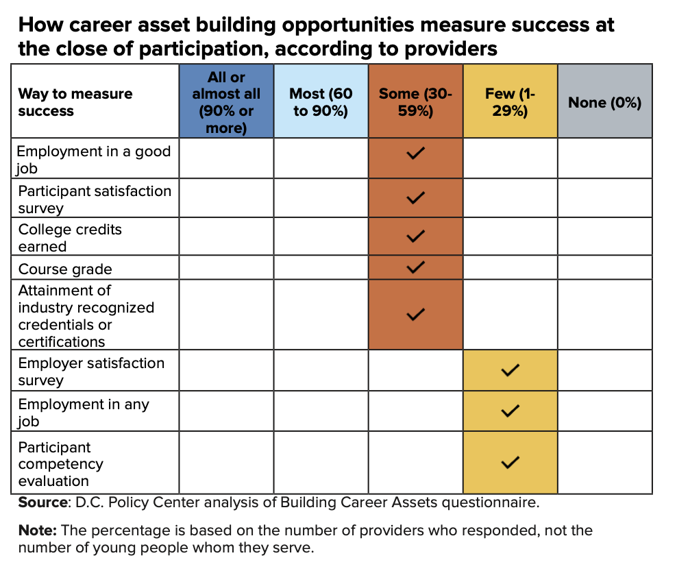 - At the close of participation, some providers measure success through participant surveys, or outcomes such as college credits earned, course grades, employment in a good job, or attainment of industry-recognized credentials or certifications.