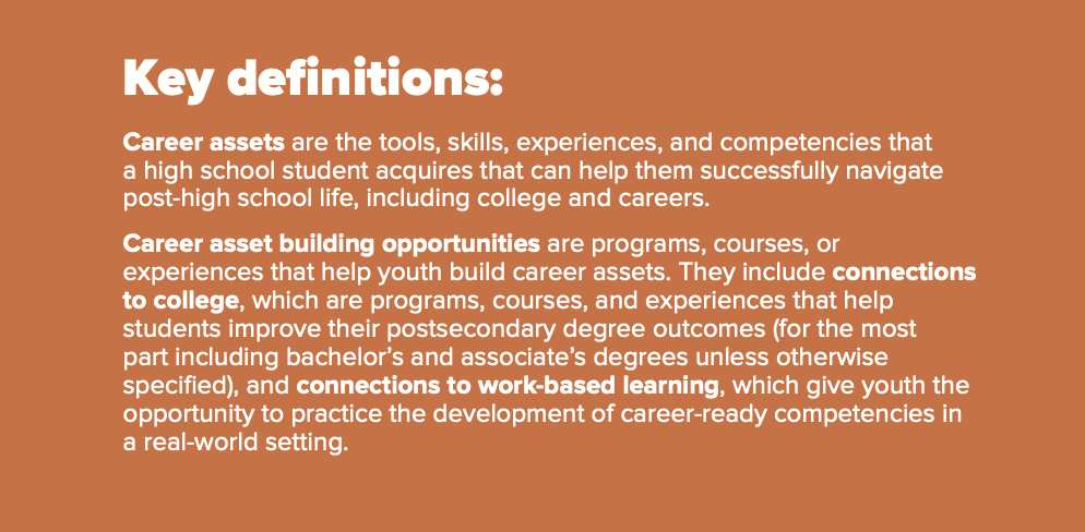 This report provides a high-level landscape to help better understand what career asset building opportunities are available to high school-aged youth as a starting point to understanding quality, equity, and gaps in offerings. The analysis begins with an overview of high school students and postsecondary outcomes. It continues with a baseline look at how students connect to college and work-based learning, including program descriptions, program access, and methods that program providers use for measuring and ensuring success. The landscape is based on self-reported responses to a provider survey, or their view of their offerings. It does not look at the quality of these opportunities or which approaches are most effective, which could be a topic for further study as new data become available. The report concludes with an analysis of strengths and gaps in the existing opportunities to build career assets, key research questions, and next steps.