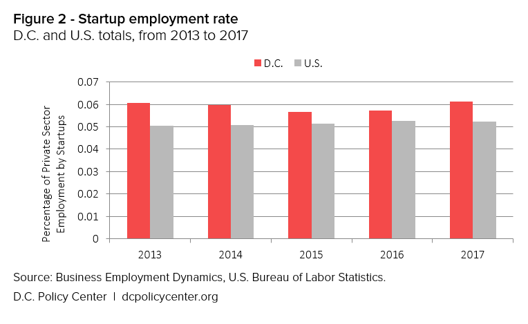 Data points cited in this article and in charts were based on calculations made using Business Employment Dynamics statistics, from the U.S. Bureau of Labor Statistics, for Washington, D.C. and the United States as a whole from 2007 to 2016. The “startup establishment rate” is the percentage of private-sector establishment births, defined by the BLS as the moment when a business establishment hires at least one employee for the first time.