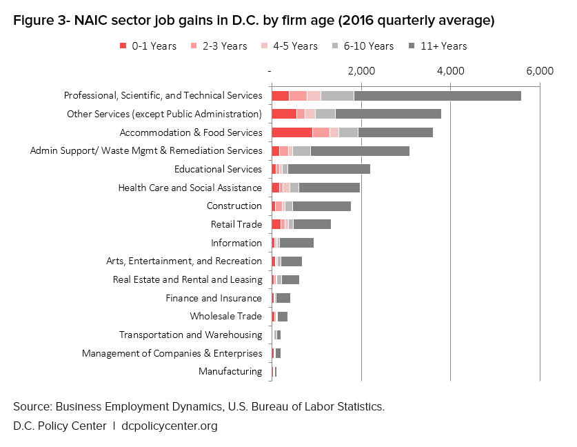 Manufacturing has never been a strong suit of the District’s economy. In 2016, the Manufacturing sector created just over 100 jobs each quarter on average. Yet, nearly a quarter of those jobs were created by startup firms, mostly by those tied to food manufacturing such as bakeries and breweries.