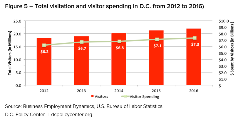 Several factors may be driving startup success within this sector. For starters, the continuous increase of tourists visiting the District (22 million visitors in 2016 compared to 18.3 million in 2012) has fueled the overall growth in the sector in recent years. In 2016 alone, tourists spent over $7 billions during their visit in the city, 63 percent of which was spent on lodging and food and beverage services. Figure 5 (below) illustrates recent trends in District tourism, including total visits and overall visitor spending, from 2012 to 2016.