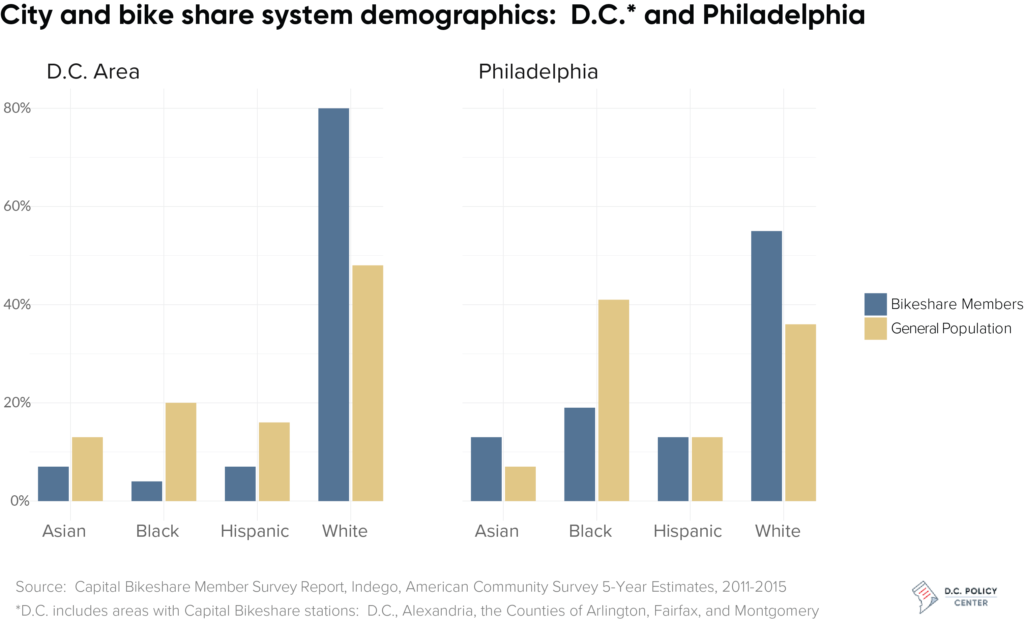 Disparities in bikeshare usage aren’t unique to D.C., and there are lessons to be learned from other cities that have sought to improve access and usage of their local bike shares. Among the better practices that Capital Bikeshare should adopt, many have been implemented in Philadelphia, whose Indego system has had more success in reaching out to nonwhite city residents.
