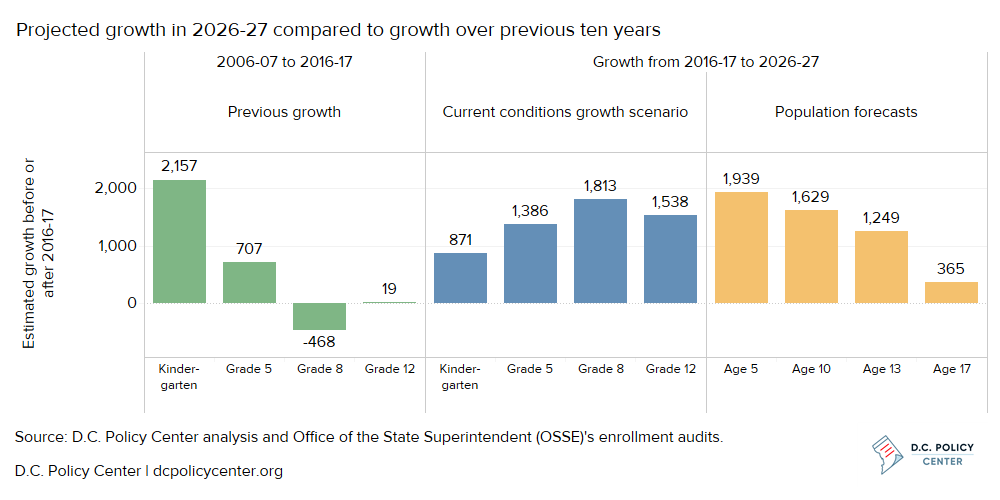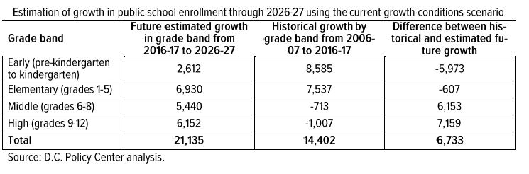 This analysis estimates future public school enrollment based on the number of births in D.C., public school enrollment in previous years, and transition rates between grade bands. If current conditions continue, there would be an increase of approximately 21,100 pre-kindergarten to grade 12 students from 2016-17 to enrollment of 104,591 students in 2026-27. Compared to past increases in enrollment, this growth is likely to be especially large in middle school over the next five years and in high school over the next ten years.