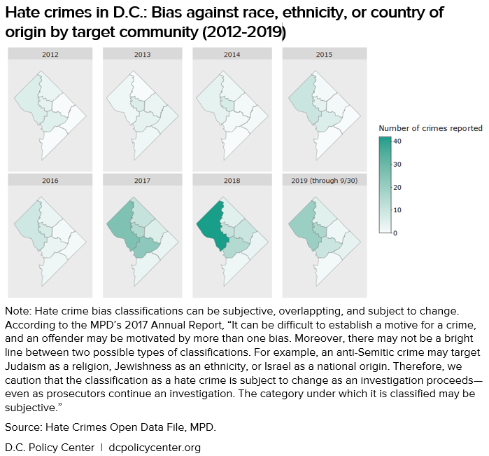 [2] All but 3 of the 108 reported hate crimes during January 1 – June 30, 2019 were race or gender-based hate crimes. Race-bias crimes (58) include bias against victims Ethnicity or National Origin (34), Race (24); anti-LGBTQ crimes (47) include those driven by bias against gender identity (12), sex or gender (2), and sexual orientation (33). See https://mpdc.dc.gov/hatecrimes