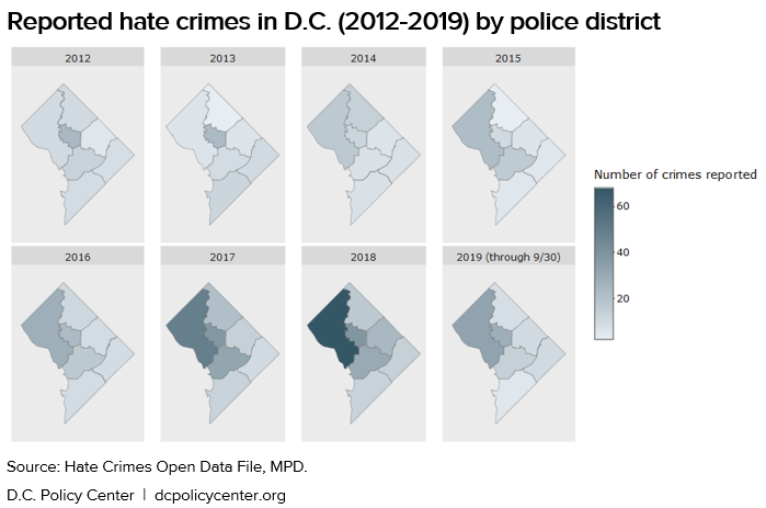 Data on hate crimes in D.C. is from the Metropolitan Police Department (MPD). Up-to-date data tables and annual reports on bias-related crimes are available at https://mpdc.dc.gov/hatecrimes. The Hate Crimes Open Data File, with more detailed incident-level data from 2012 through June 30, 2019 as of the time of publication, is available here. (The hate crimes tracking spreadsheet is not an official MPD database of record and may not match details in records pulled from the official Records Management System.)