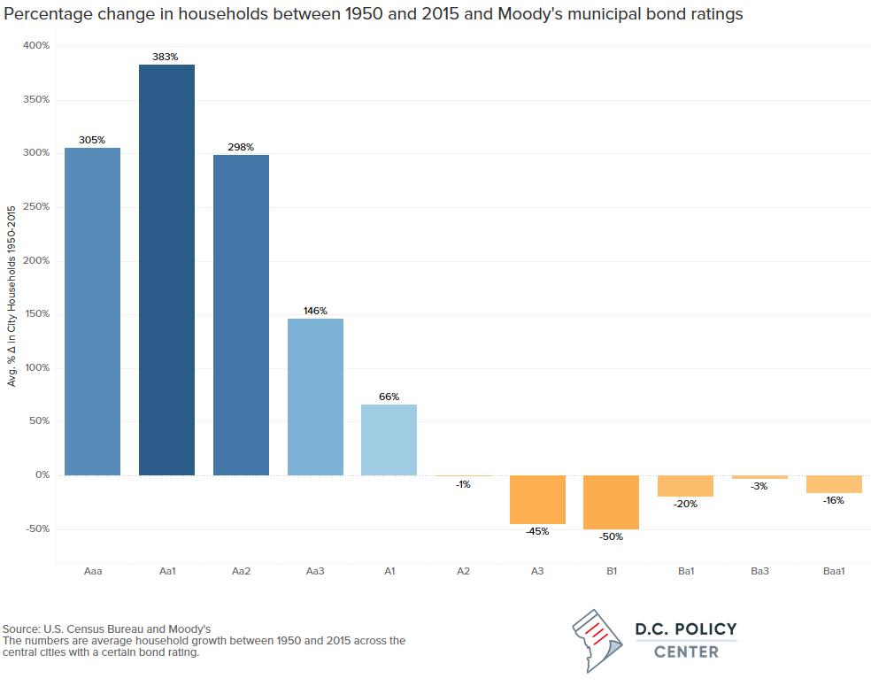 The eleven household-losing cities average A3 bond ratings (mediocre). Population-losing but household-gaining Washington, DC and its four mates average Aa1 bond ratings (excellent).[2] Thirty-one population-gaining and household-gaining cities also average Aa bond ratings (this group includes eight of the nine “blue chip” cities).[3]