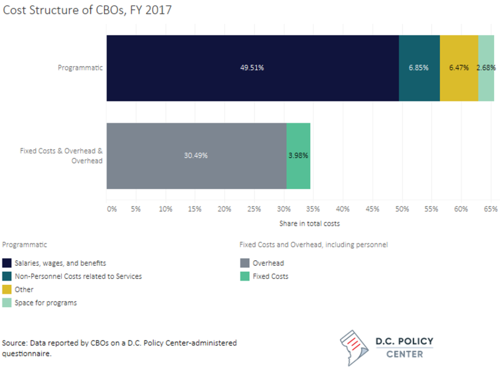 CBOs also report different cost patterns compared with agency- or school-provided programs. First, the overhead costs at CBOs in D.C. are much higher on average compared to the afterschool and summer programs provided by DCPS. The estimated share of overhead costs across all CBOs for which we have information is approximately 34 percent. While administrative personnel accounts for most of these funds, the cost of space for CBOs is sometimes substantial. Data from CBOs suggest that the biggest determinant of space costs is whether an organization delivers services on school property or at some other location; among those that have access to school property, only 6 percent of costs are associated with space, compared to 25 percent among CBOs that do not have access to school space. Discussed later in this section are the impacts that CBOs must report to meet the requirements imposed by grant rules or donor wishes, which often include restrictions on what the funds could be used to pay for or where they could be spent.
