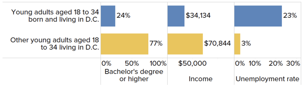 Figure 1. Early Career Outcomes for longtime D.C. residents and peers who moved to D.C. after birth as young adults