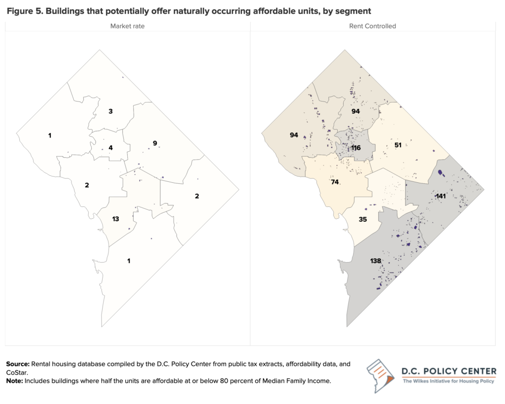 Data on rental housing units was compiled using data from CAMA ARU Derived Counts and excluding all owner-occupied housing (estimated using the homestead exemption code). The D.C. Policy Center also compiled a database to determine rents and market segmentation using a combination of public tax extracts, data on affordable housing units (available at opendata.gov) and CoStar. This database was constructed in October, 2024 and reflects the data available at that time.