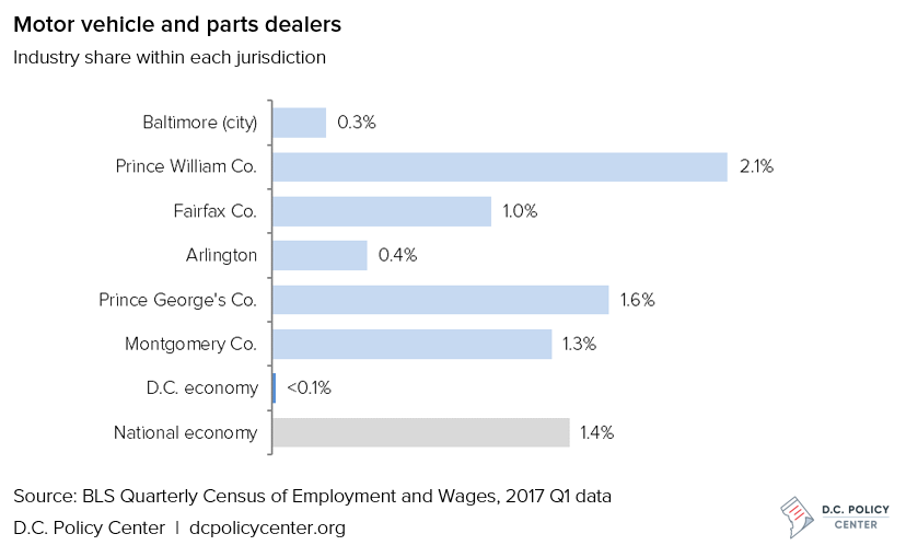 Motor vehicle and parts dealers are much less common in D.C. compared to surrounding jurisdictions. They’re most prevalent in suburban Prince William County, Va., and Prince George’s County, Md.