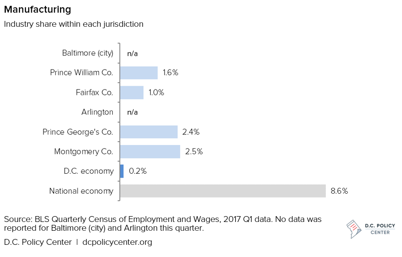While D.C.’s concentration of manufacturing employment is low, jobs in the industry are generally uncommon across the region. The sector makes up nearly 9 percent of total U.S. employment. In Montgomery County, which reported the highest concentration locally, the share is a mere 2.5 percent. The counties surrounding the District only employ a few thousand such workers each.
