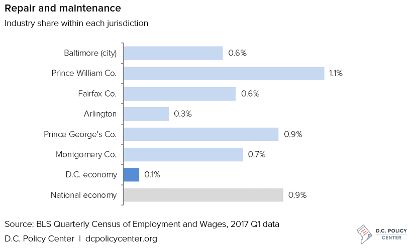 The overwhelming majority of employees nationally classified in this industry work in automotive repairs, and the same is true of D.C. The District’s economy supported only 700 repair and maintenance jobs, with most of those related to automotive work.