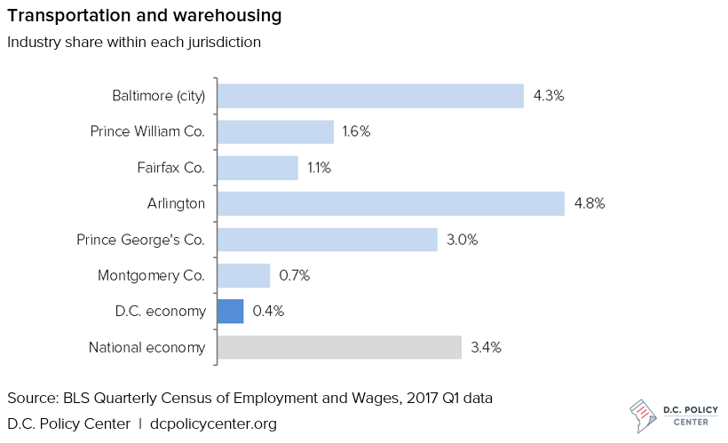 While transportation and warehousing is particularly absent in D.C, the sector has a larger role in several surrounding counties. Industry shares are notably higher in the city of Baltimore (4.3 percent), Arlington (4.8 percent) and Prince George’s County (3 percent), compared with less than one-half of a percent of D.C. jobs and 3.4 percent of jobs nationally.