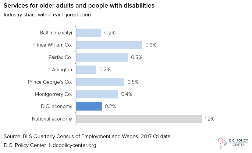 Jobs in services for older adults and people living with disabilities are also relatively low throughout the region. These jobs account for an estimated 1.2 percent of employment nationally, but only about half a percent in Fairfax, Prince George’s, and Prince William counties.