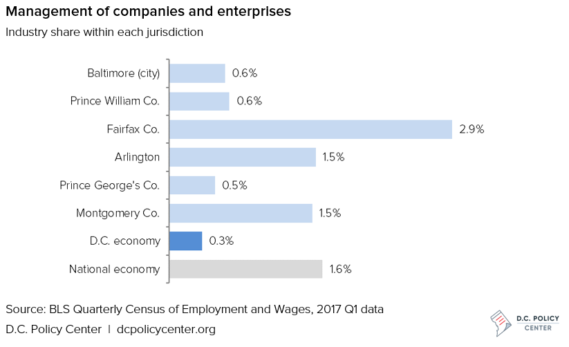 While quite a few top managers in government work in the District, the same cannot be said of those managing some corporations and holding companies. The industry employs more than 2 million people nationally, but only about 2,600 in D.C. The Labor Department defines the classification as establishments holding the securities of companies “for the purpose of owning a controlling interest or influencing management decisions” or those that “administer, oversee, and manage establishments of the company or enterprise.” (The few such jobs that are in D.C. tend to pay well, with a wage location quotient of 1.31.) Arlington, Fairfax and Montgomery counties are all home to larger concentrations of these jobs than D.C. and other areas.