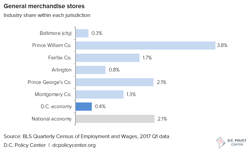 General merchandise stores are less common in D.C. than surrounding counties. Prince William County has a particularly high share of these jobs — nearly double the national rate.